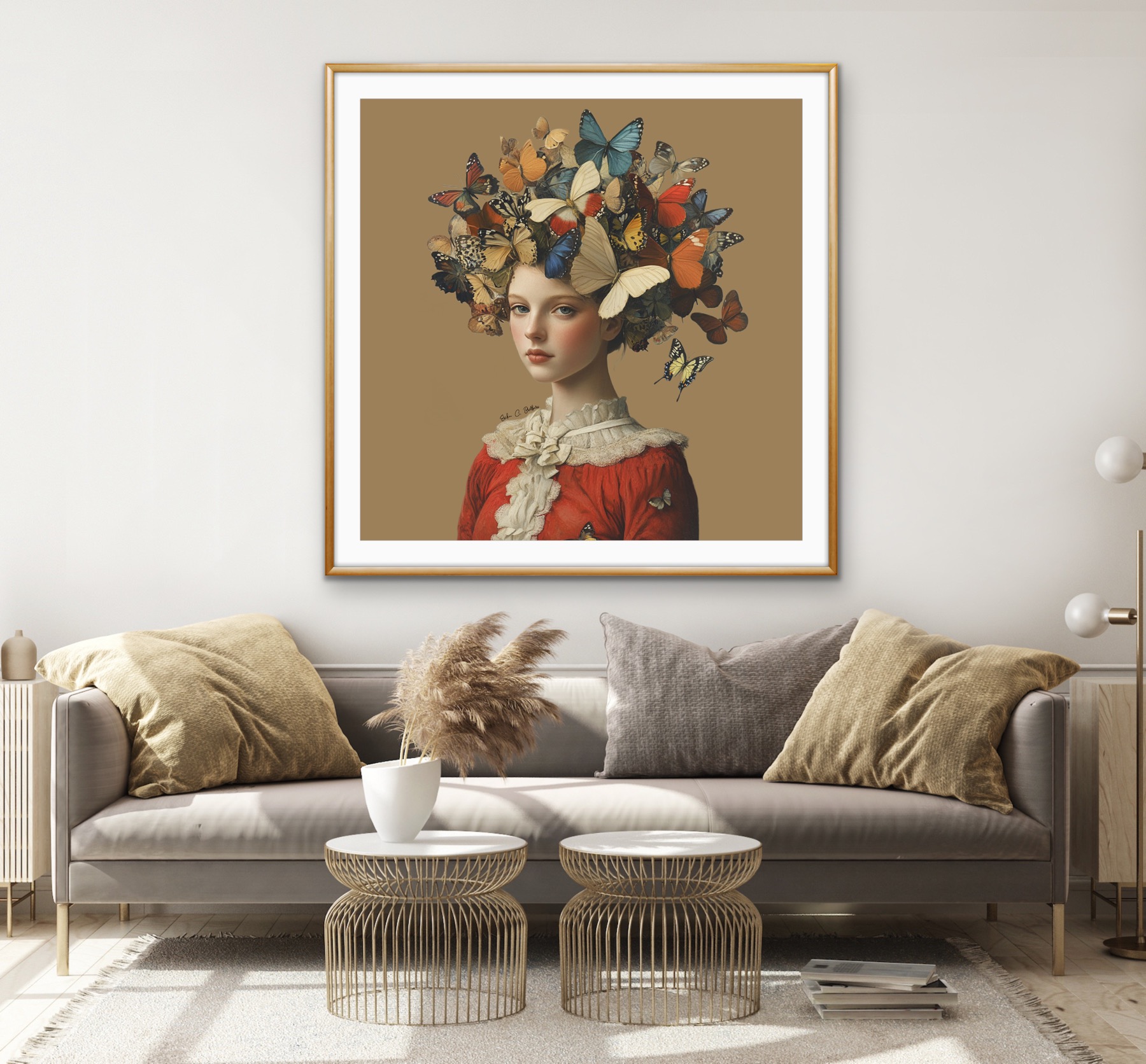 The astronaut is the central figure in the image, encased in a bright yellow helmet that reflects the surrounding field of orange blossoms. The helmet, designed to protect its wearer in the harsh environment of space, seems almost out of place amidst the delicate flowers. Yet, this contrast highlights the astronaut’s isolation, suggesting a sense of longing or contemplation as they find themselves in an unexpected environment. The visor of the helmet reflects the orange flowers around them, creating an illusion that the astronaut is not just surrounded by the flowers, but almost merging with them, becoming one with this unexpected setting.
