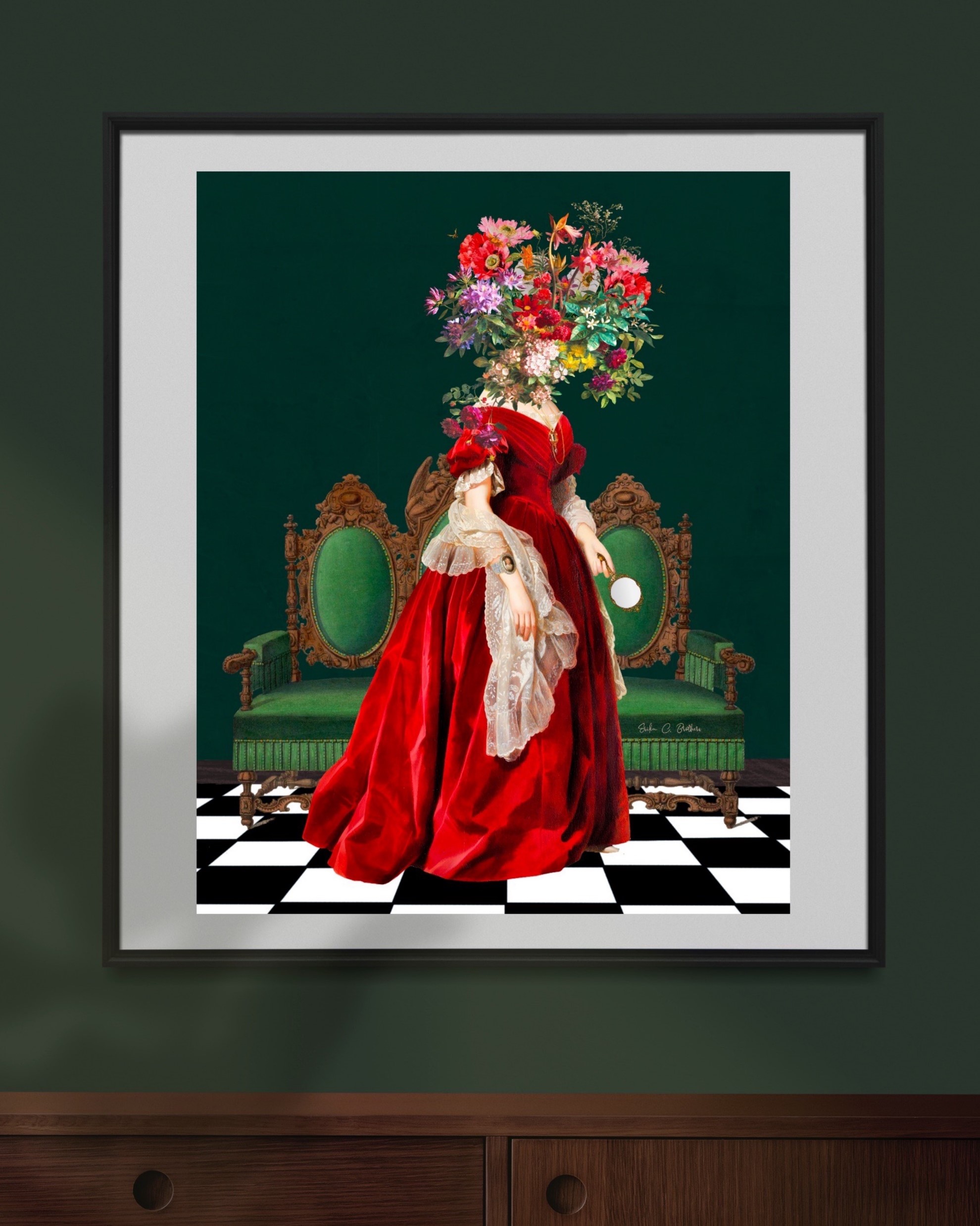 Beneath the figure’s feet, the floor is covered in a black-and-white checkered pattern, which adds a geometric element to the composition. This patterned floor contrasts with the organic forms of the flowers and adds to the overall surreal atmosphere, reminiscent of a chessboard or a stage, suggesting that the scene may be a part of a larger narrative or dreamscape.