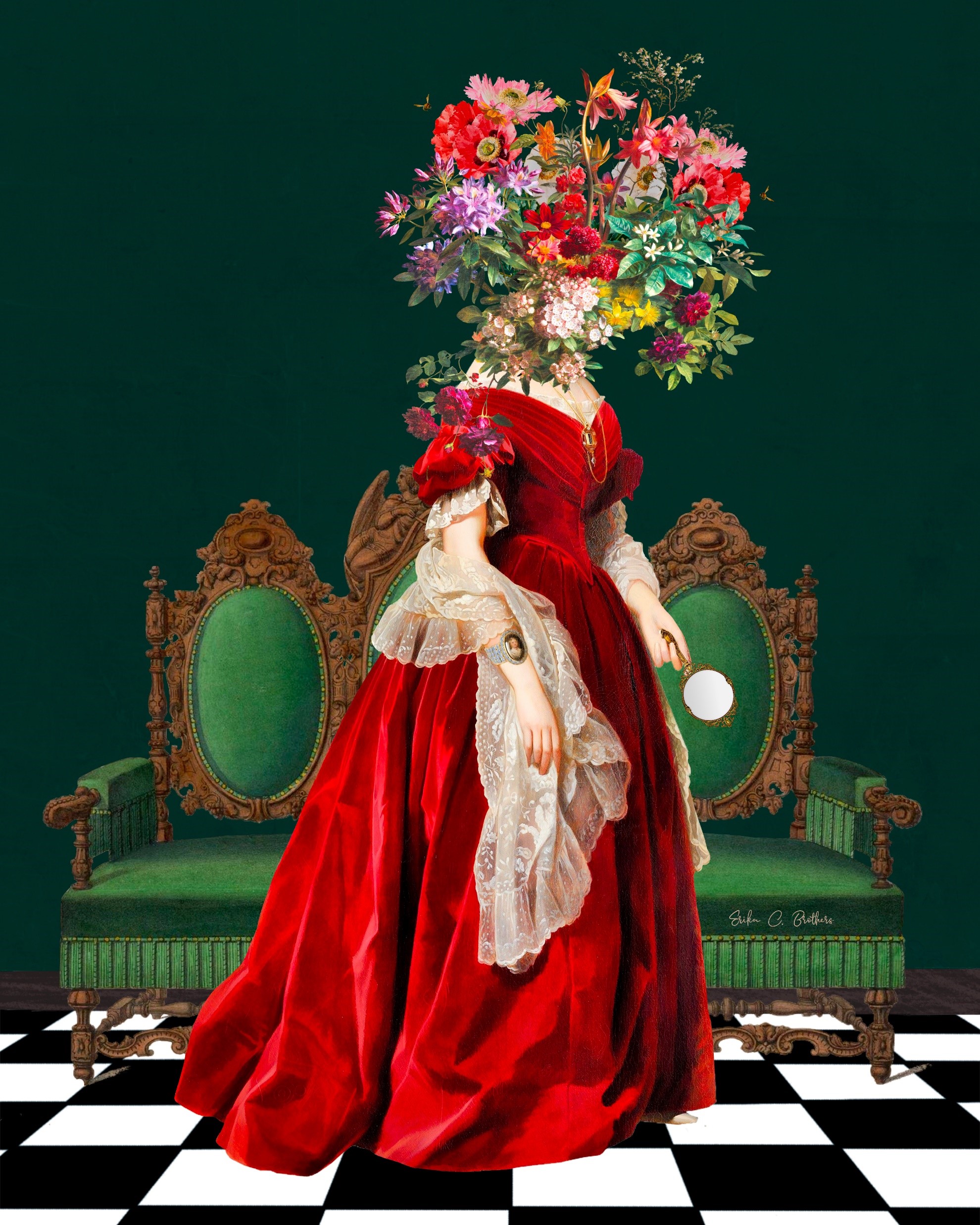 The woman’s pose is poised and graceful, with one hand delicately holding a small round mirror, and the other resting gently on her dress. Her posture, combined with the intricate gown, suggests an air of nobility and refinement, yet the surreal aspect of the portrait immediately captures the viewer’s attention: instead of a human head, a profusion of flowers erupts from her neck. This floral arrangement is vibrant and diverse, featuring a wide array of blossoms in various colors, including reds, pinks, purples, and greens. The flowers are depicted in meticulous detail, with petals, leaves, and stems intertwining and creating a sense of movement and life. This head of flowers adds a fantastical and whimsical element to the portrait, transforming it into a visual representation of nature and imagination merging with human form.