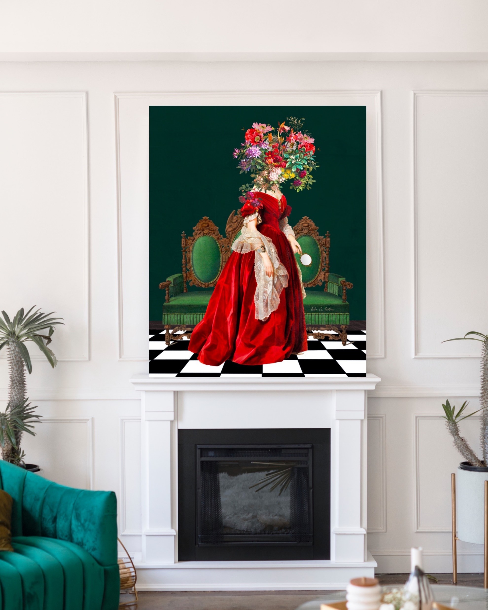 The surreal nature of the image, with the head replaced by flowers, evokes themes of transformation, growth, and the fusion of human and natural beauty. It suggests a sense of becoming, as if the woman is part of an ongoing metamorphosis, blending the elegance of the past with the boundless creativity of the imagination.