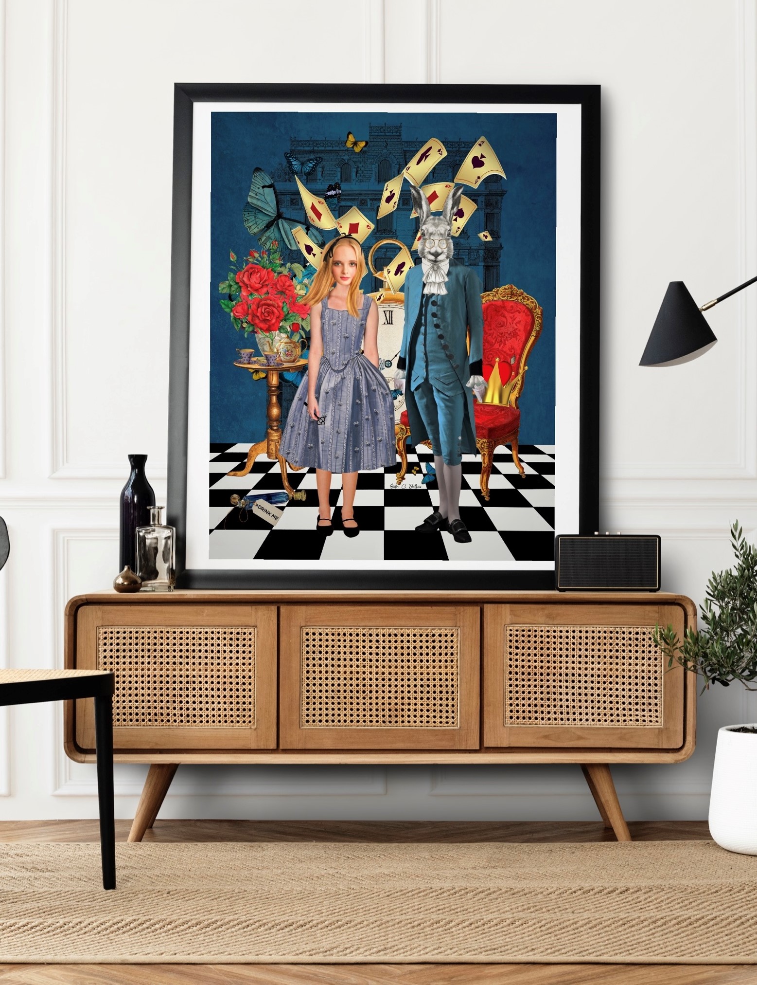 Next to her stands a figure with the body of a man and the head of a rabbit. This anthropomorphic character is dressed in a formal, Victorian-style suit, complete with a cravat and a long coat. The rabbit’s head is meticulously detailed, with large ears and expressive eyes that seem to watch over the scene with a mix of wisdom and curiosity. This blend of human and animal characteristics creates an intriguing and surreal effect, drawing the viewer into a world where reality and fantasy intertwine.