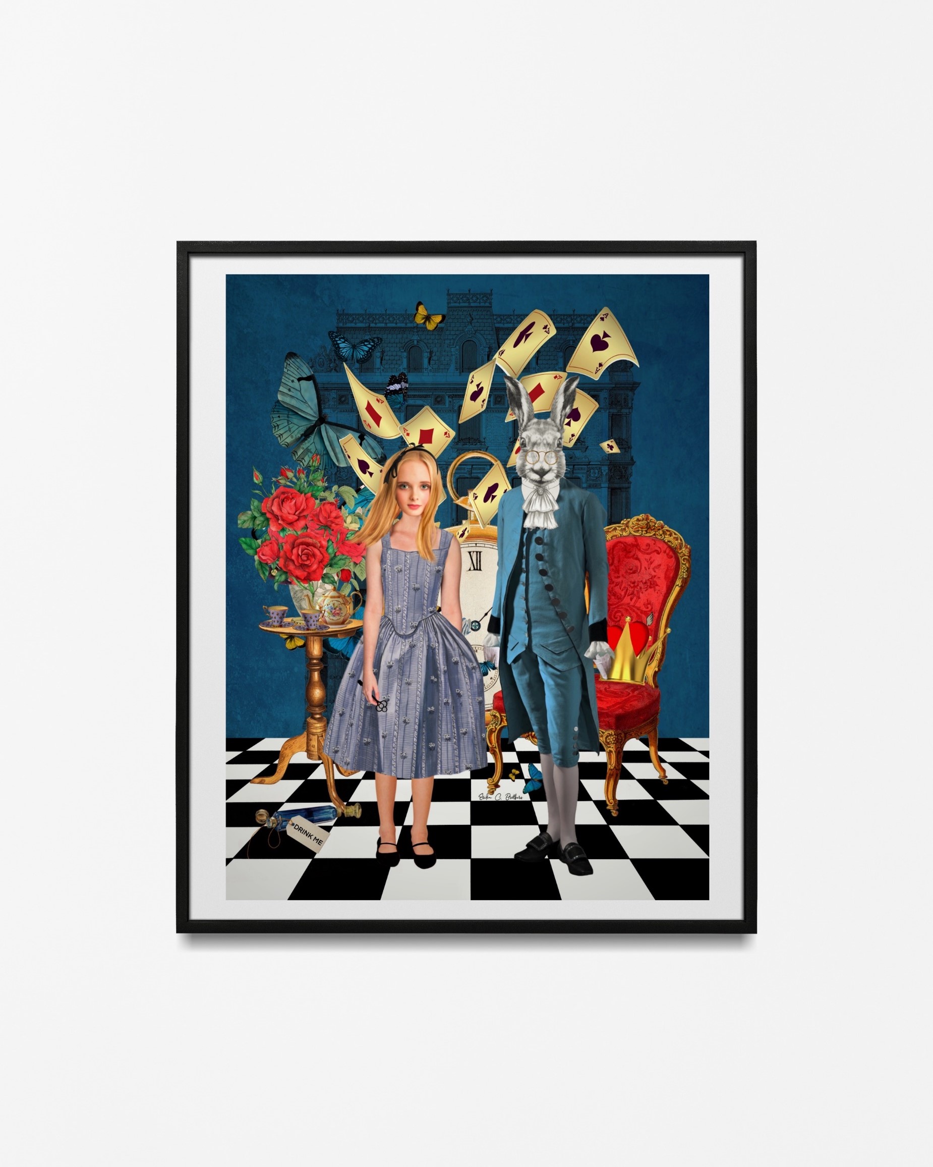 The overall composition of the image is meticulously balanced, with each element carefully placed to create a cohesive and visually engaging scene. The combination of the young girl, the rabbit-headed figure, the floating cards and butterflies, and the richly detailed background creates a fantastical narrative that invites the viewer to step into a world of imagination and wonder.