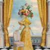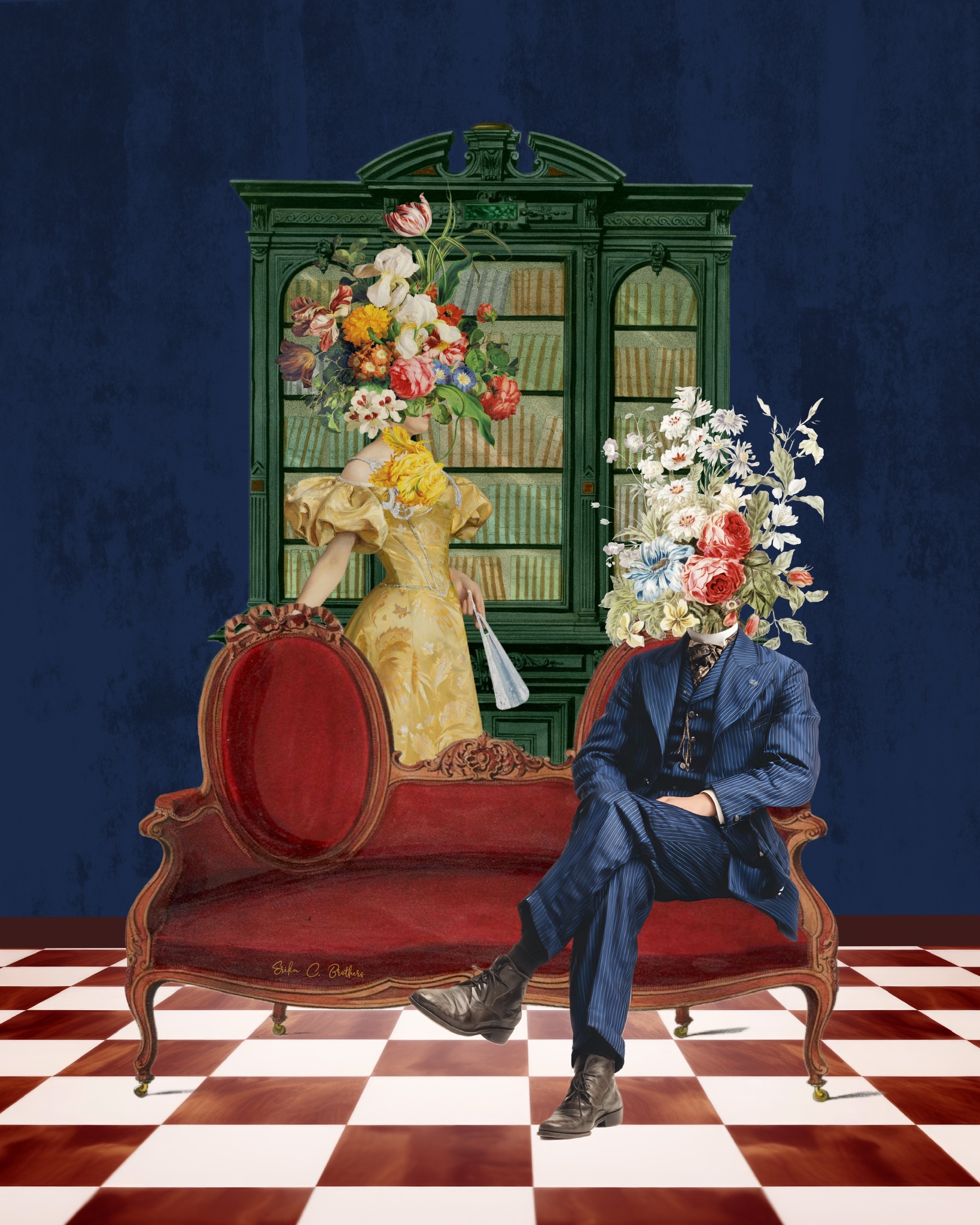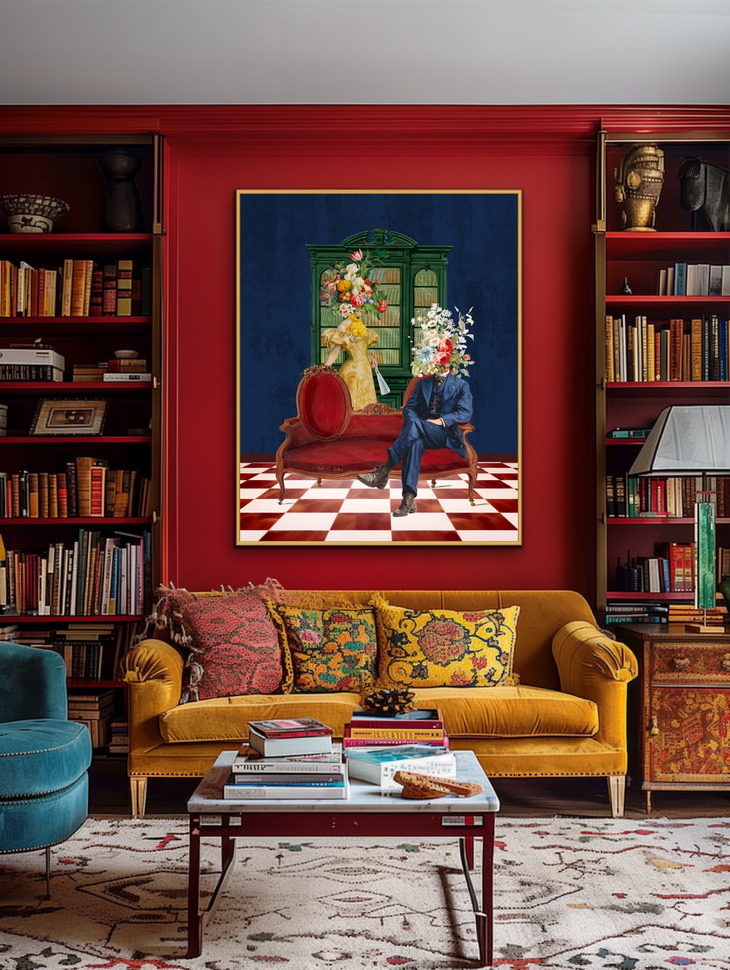 Set against a rich blue backdrop with a vintage cabinet and a bold checkered floor, this piece blends portraiture, still life, and interior storytelling into a single composition. The contrast between the deep tones, the red velvet seating, and the vibrant florals creates a visually striking and layered narrative.