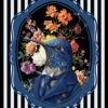 The contrast between the modern patterned background and the intricate vintage-inspired details highlights the artist’s distinctive style—blending surrealism, botanical collage, and storytelling.
