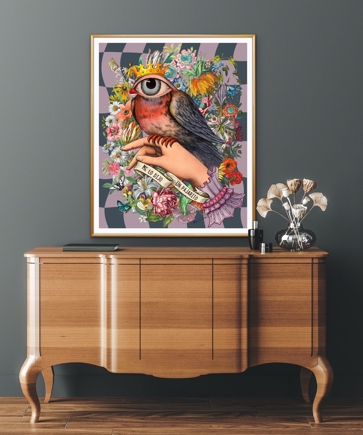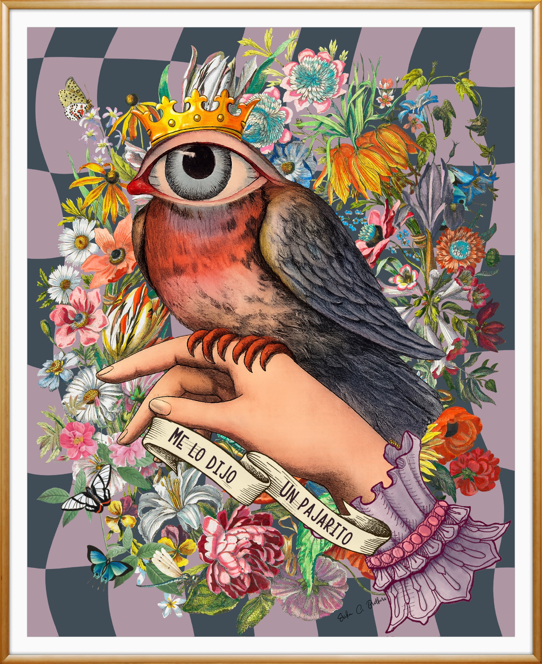 Inspired by the popular Spanish saying “A little bird told me”, widely used in Mexican culture, this artwork by Erika C. Brothers transforms a familiar phrase into a visually rich and symbolic narrative.