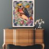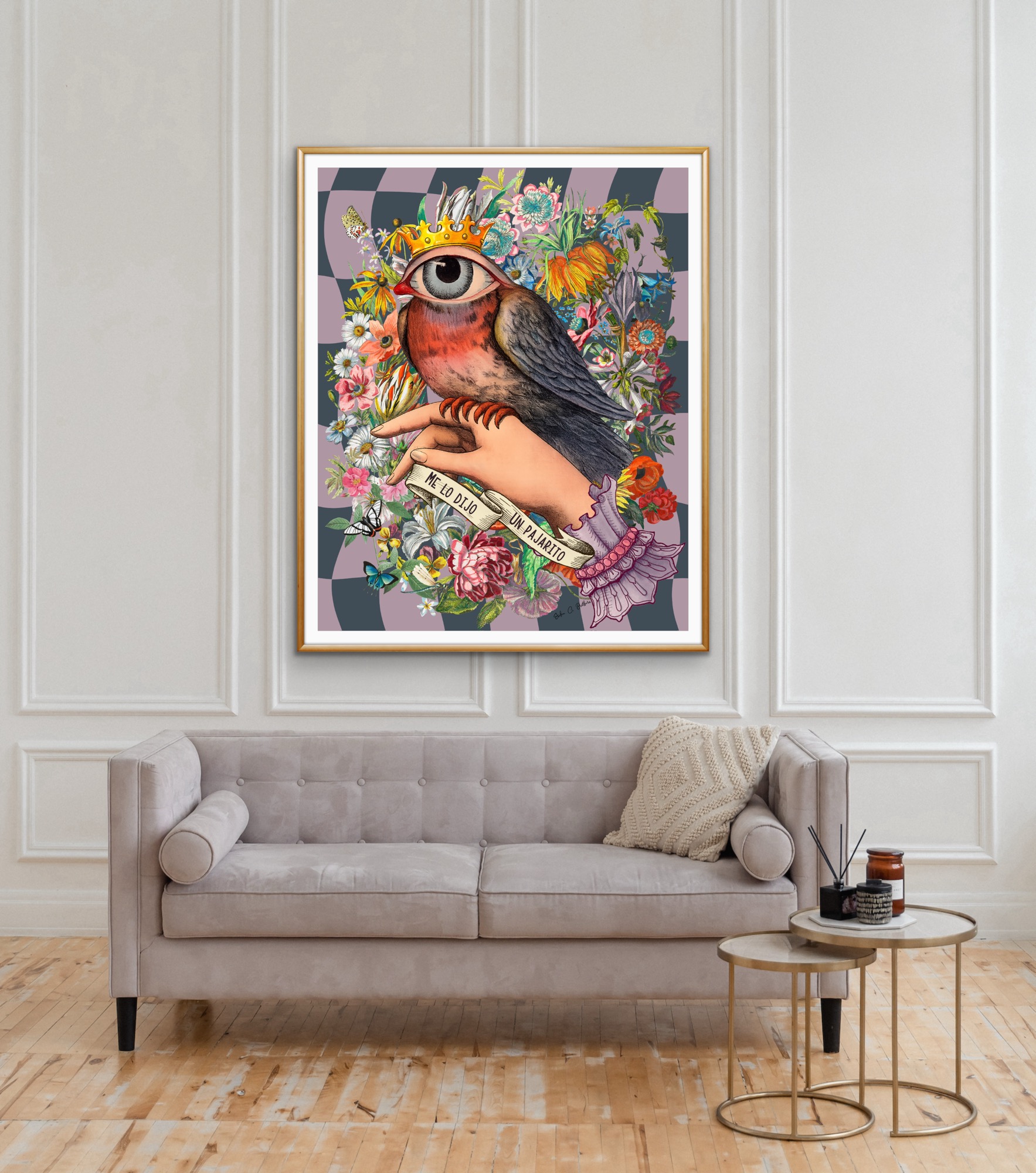 The piece features a surreal bird with a single crowned eye, delicately perched on a hand, surrounded by an abundant composition of vibrant flowers and botanical elements. The imagery evokes whispers, intuition, and hidden messages, inviting the viewer into a dreamlike world where nature and imagination intertwine.