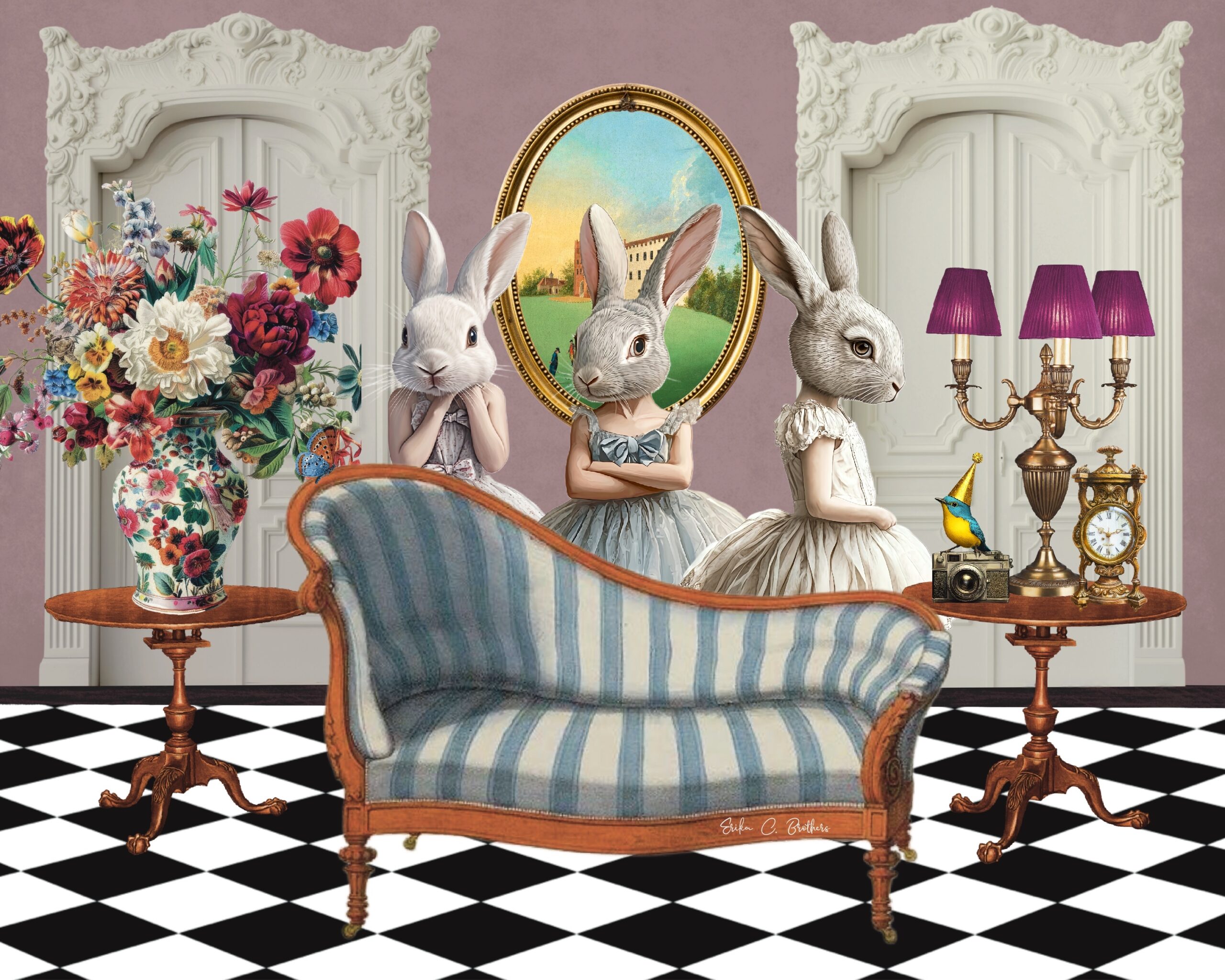 On a personal level, my artistic style is deeply rooted in Kitsch, a style known for its vibrant colors, bold shapes, and striking elements. I often incorporate illustrations from the public domain into my work. My fascination with antiquities and furniture is a recurring theme, evident in the costumes of my characters and the environments where my works’ narratives unfold.